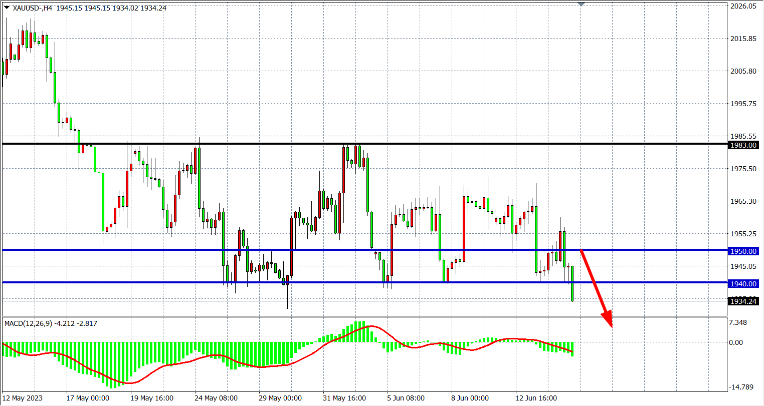 周三(6月14日)公布的PPI数据创2020年12月以来新低,美指和美债收益率双双下跌,随后美联储如期暂停加息,但是点阵图暗示年内还有2次各25个基点的加息,比市场预期的更为鹰派。现货黄金在决议前受益于美元和美债收益率走低的提振,一度涨超16美元并上破1960美元关口,但在决议公布后从日高跌超20美元,一度失守1940关口,最终收跌0.12%。
