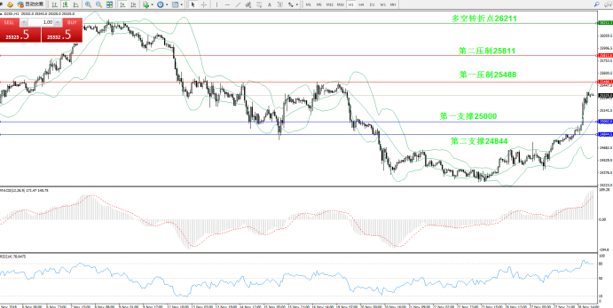 交易策略:倾向于上破第一压制25488附近做多,目标看26211附近;跌破第一支撑25000则做空,目标24844附近;